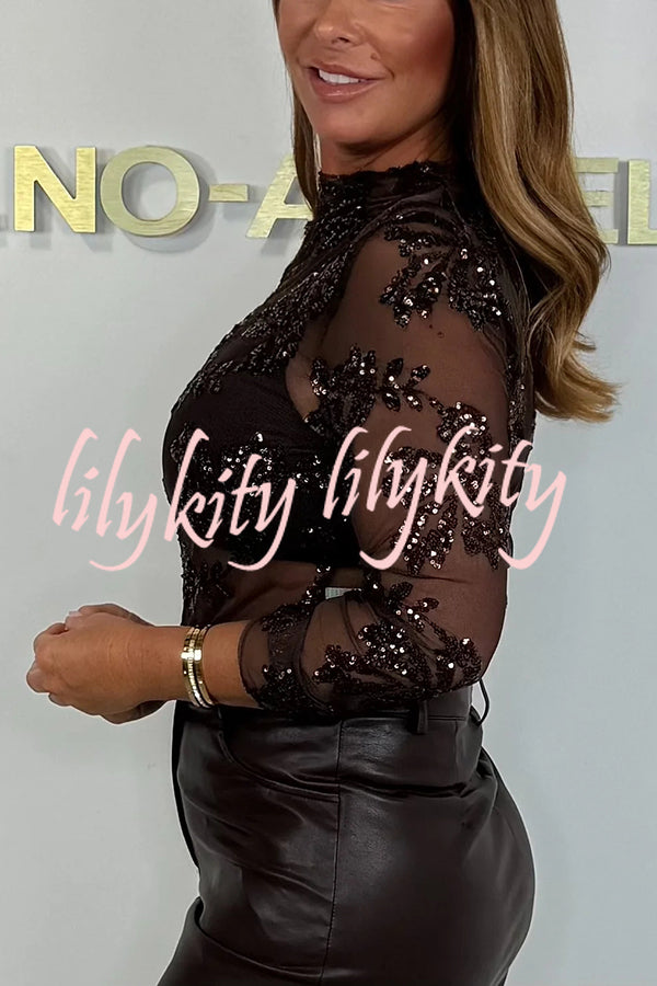 Chelsea Sheer Flower Sequin Detail Mock Neck Long Sleeve Stretch Top